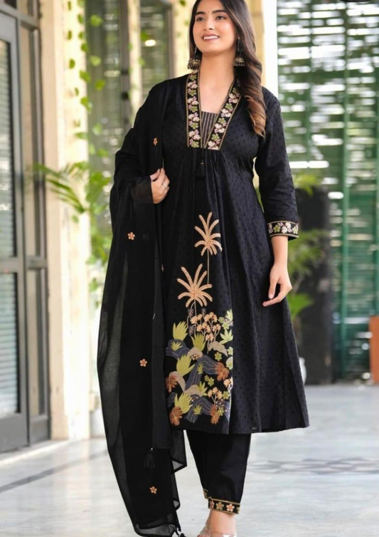 Pure Cotton Kurti Pant and Dupatta Set in Black with Heavy Embroidery