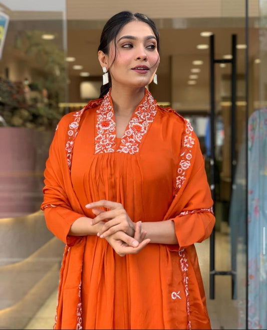 Orange V-Neck Embroidered A-line Anarkali Kurta Pant Dupatta Set