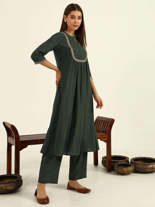 Green Viscose Chanderi A-line Kurta with Pant and Dupatta