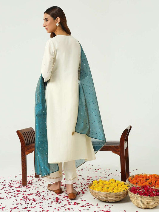 Ivory Silk Blend Embroidered Salwar Suit with Dupatta