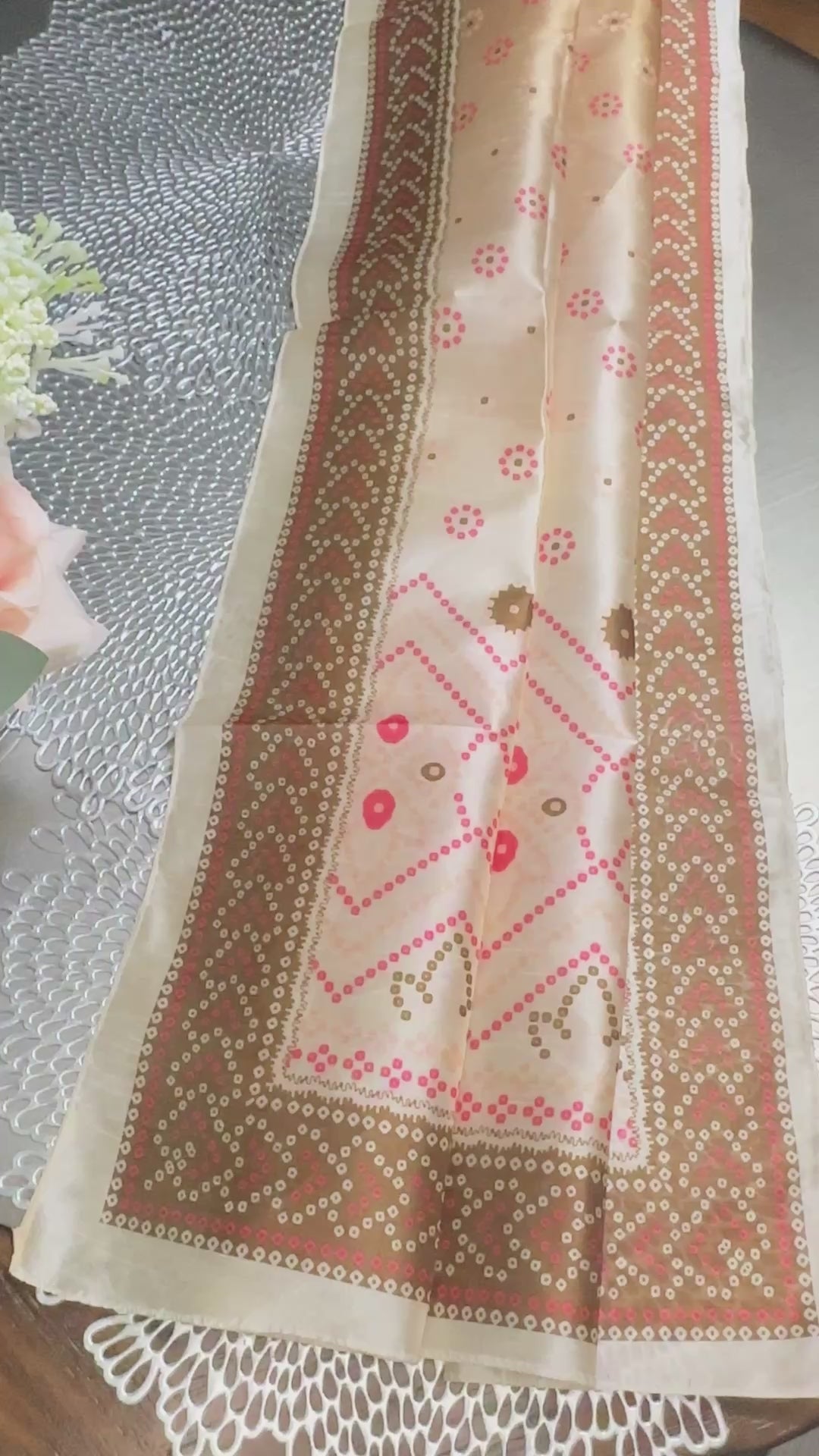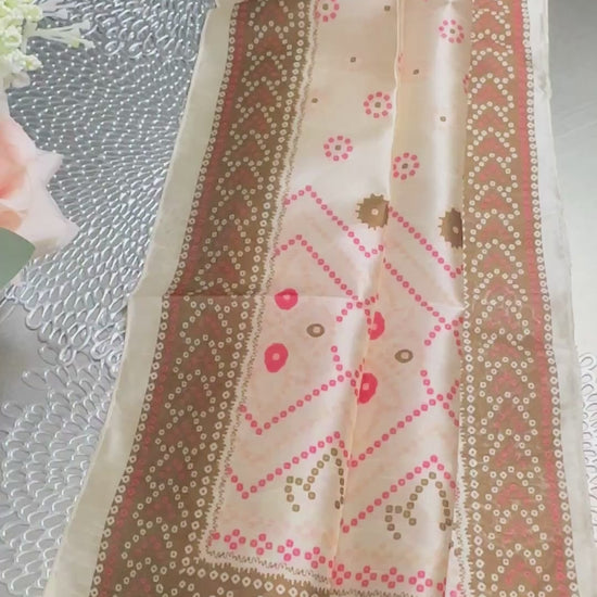 Dola Silk Kurta with lining, hand work, dola silk pant style bottom and printed bandhani dupatta.