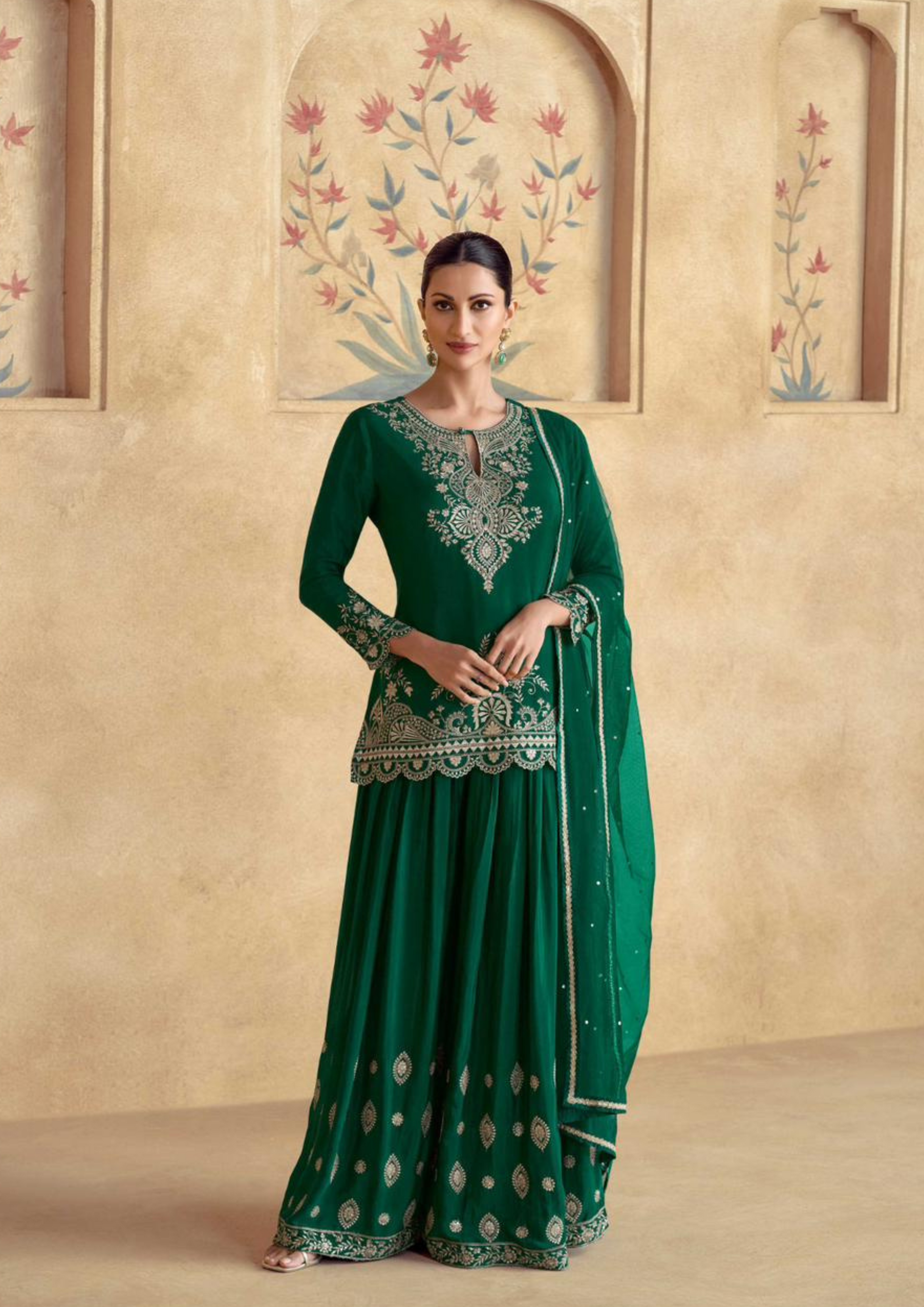 Green Premium Chinnon Silk Festive Sharara Suit Set