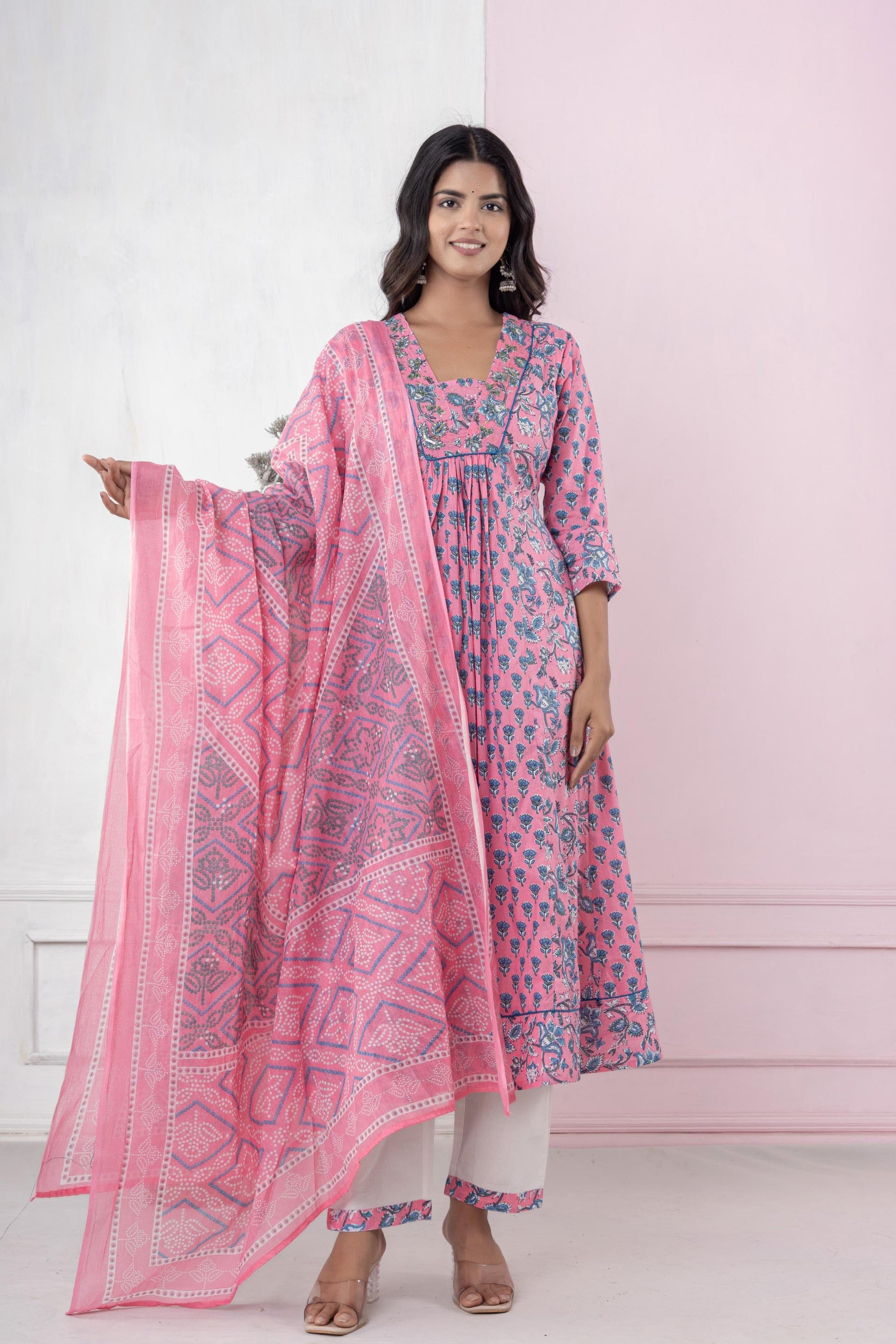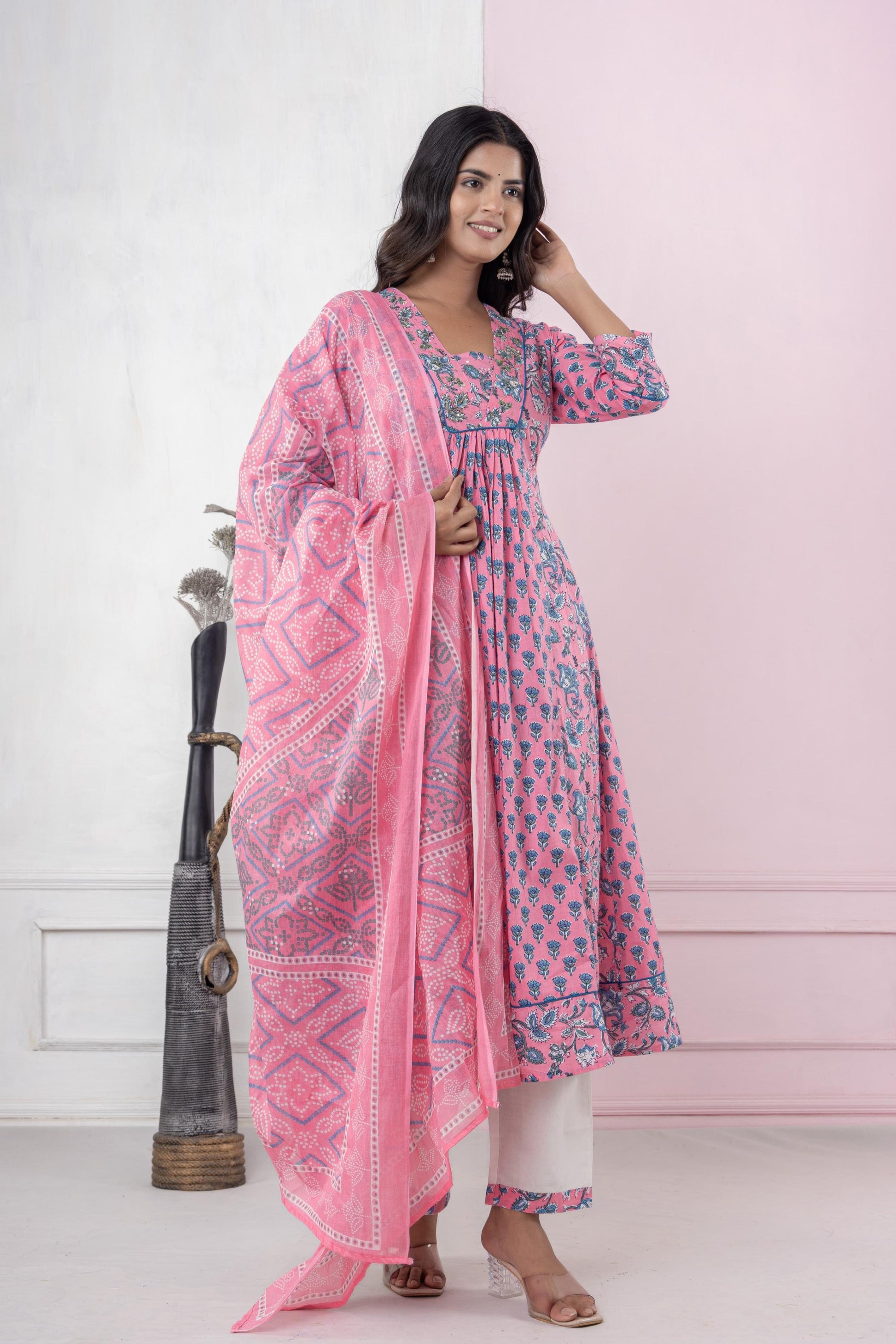 Jaipur Cotton Printed Kurta Pant and Dupatta Set in Pink