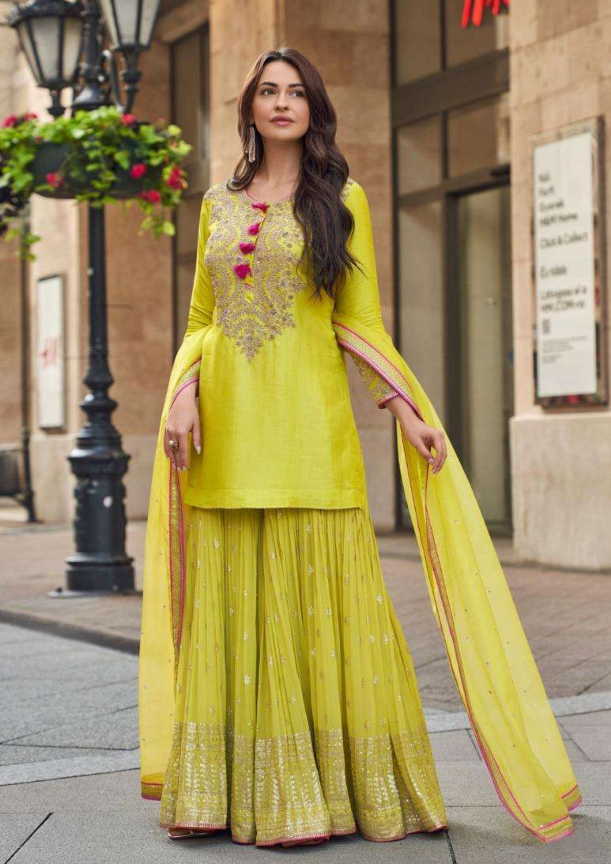 Yellow Silk Zari Embroidered Sequins Gorgeous Sharara Suit Wedding Wear